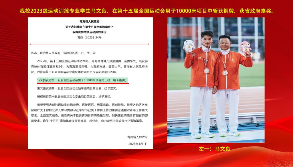 2023级运动训练专业学生马文良,因在第十五届全国运动会男子10000米项目中斩获铜牌,喜获省政府嘉奖。