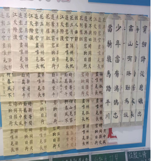 此次展示活动共有在校五十多名体育教育专业师范生的作品参展,主要展示作品有:粉笔字、钢笔字、毛笔字、实操及体育绘图等技能,展示地点为体育馆一楼学生科走廊。